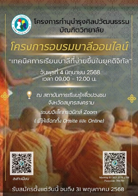 วันพุธที่ ๔ มิถุนายน พ.ศ. ๒๕๖๘ บัณฑิตวิทยาลัย สถาบันการเรียนรู้เพื่อปวงชน จัดโครงการบาลีออนไลน์ “ เทคนิคการเรียนบาลีที่ง่ายขึ้นในยุคดิจิทัล” โดยระบบอิเล็คทรอนิกส์ ZOOM ซึ่งเป็นโครงการพัฒนาบทเรียนออนไลน์และสื่อส่งเสริมการเรียนรู้ภาษาบาลี ภายใต้โครงการเทคโนโลยีสารสนเทศเพื่อการศึกษาของโรงเรียนพระปริยัติธรรม มูลนิธิเทคโนโลยีสารสนเทศตามพระราชดำริสมเด็จพระกนิษฐาธิราชเจ้า กรมสมเด็จพระเทพรัตนราชสุดาฯ สยามบรมราชกุมารี ในการนี้ได้รับเกียรติจาก รองศาสตราจารย์ ดร.ศุภการ สิริไพศาล คณบดีบัณฑิตวิทยาลัย เป็นประธานกล่าวเปิดโครงการตามภารกิจหลักของสถาบันอุดมศึกษาในด้านการทำนุบำรุงศิลปะและวัฒนธรรม โดยมีคณาจารย์ บุคลากร นักศึกษา นักเรียนจากโรงเรียนเมธีชุณหะวัณวิทยาลัย และโรงเรียนสกลวิสุทธิ เข้าร่วมจำนวน ๔๐ คน